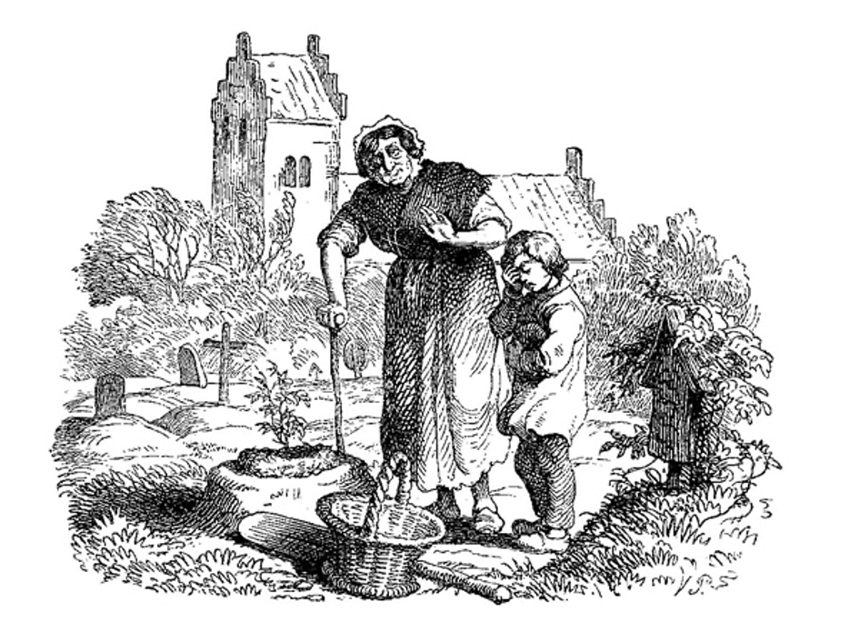 Auf den Kirchhof trug man sie, auf den Kirchhof der Armen, Marthe streute Sand auf das Grab und pflanzte einen kleinen Rosenstock darauf; der Knabe stand neben ihr.
